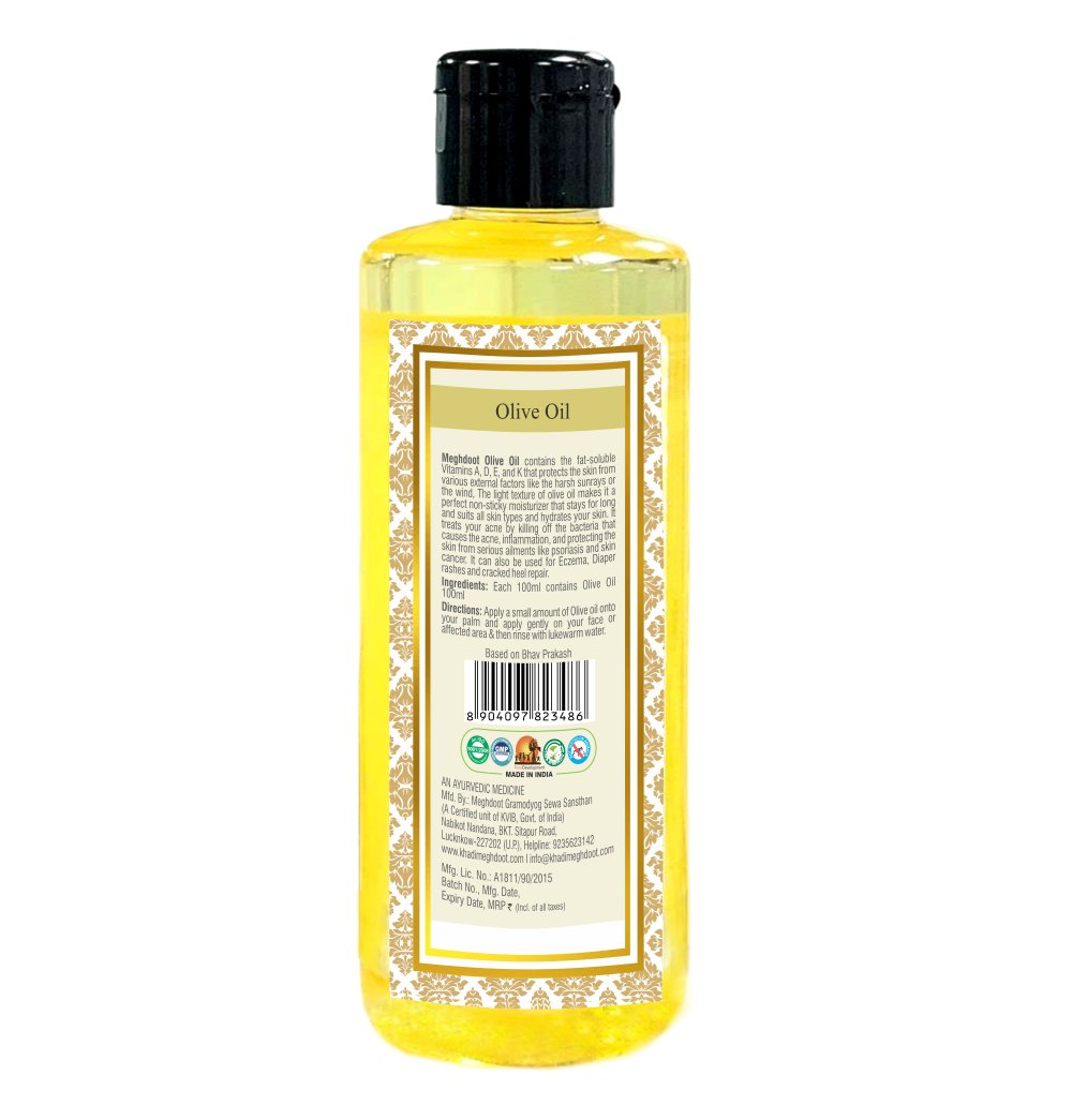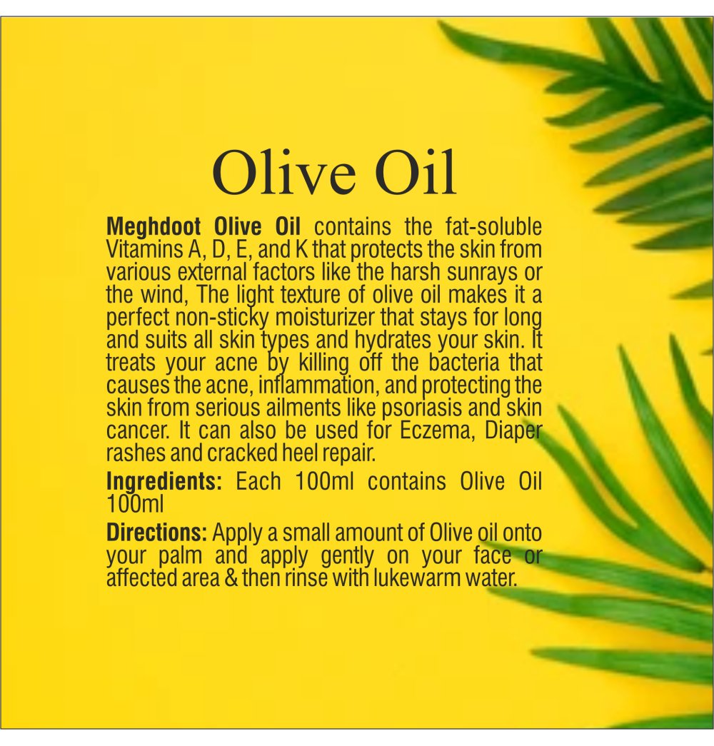 Meghdoot Pure Olive Oil, a multi-purpose oil known for its deep moisturizing and strengthening properties. Rich in natural antioxidants and essential fatty acids, olive oil helps soften dry skin, strengthen hair roots, and restore natural shine.